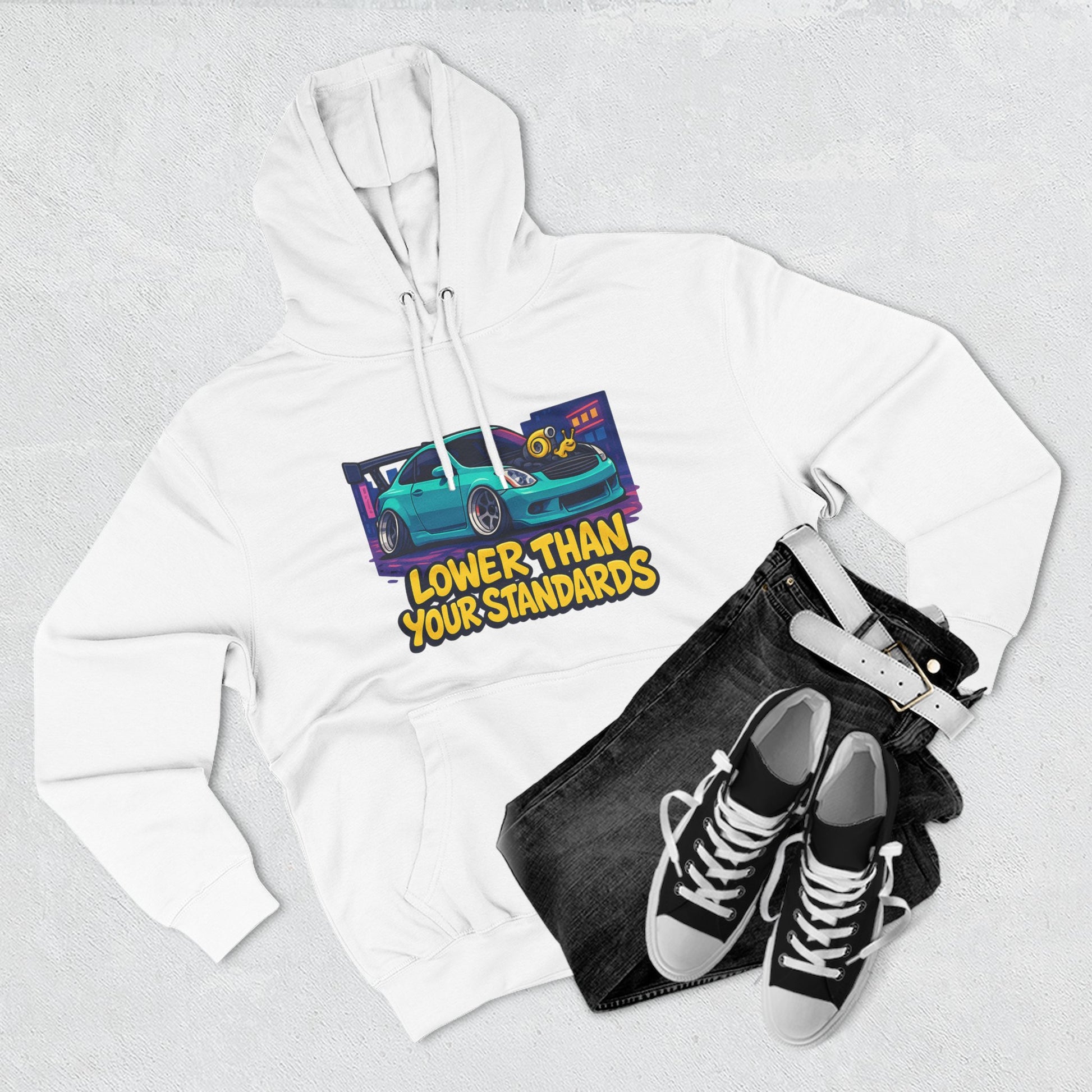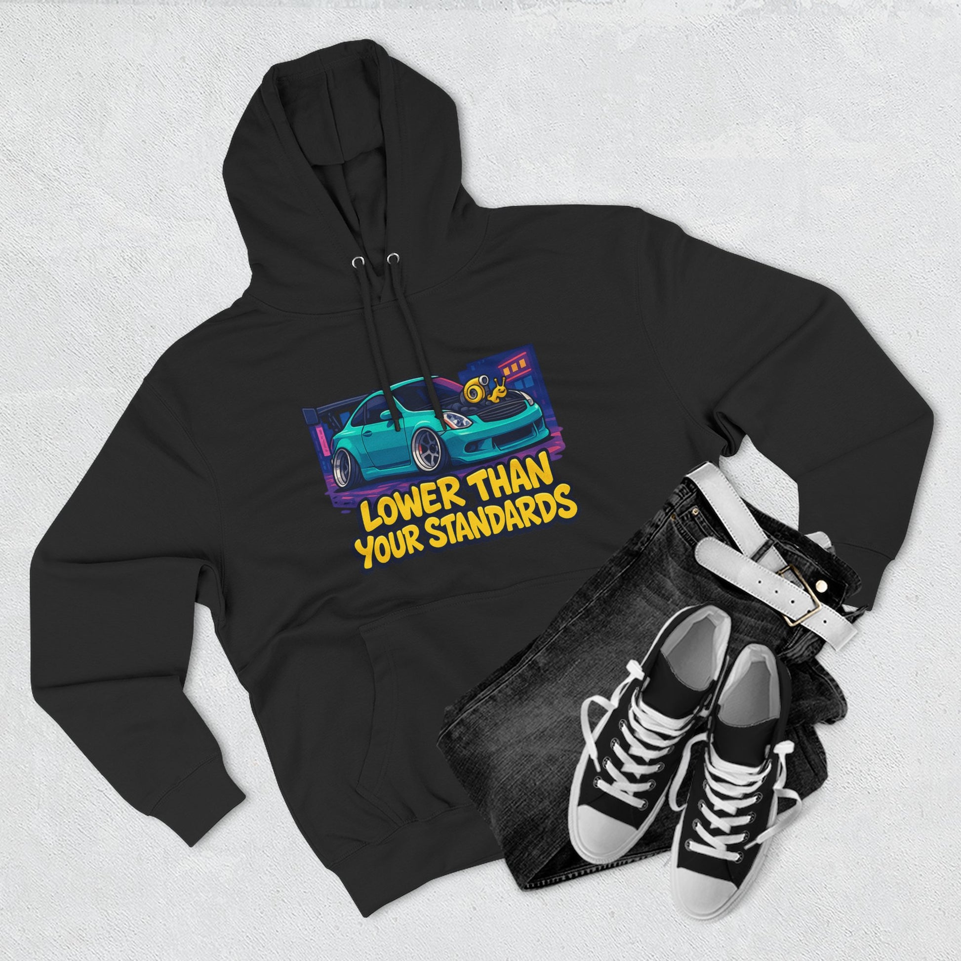 Bold cartoon design of a slammed coupe with turbo snail & graffiti text on the front: “Lower Than Your Standards”