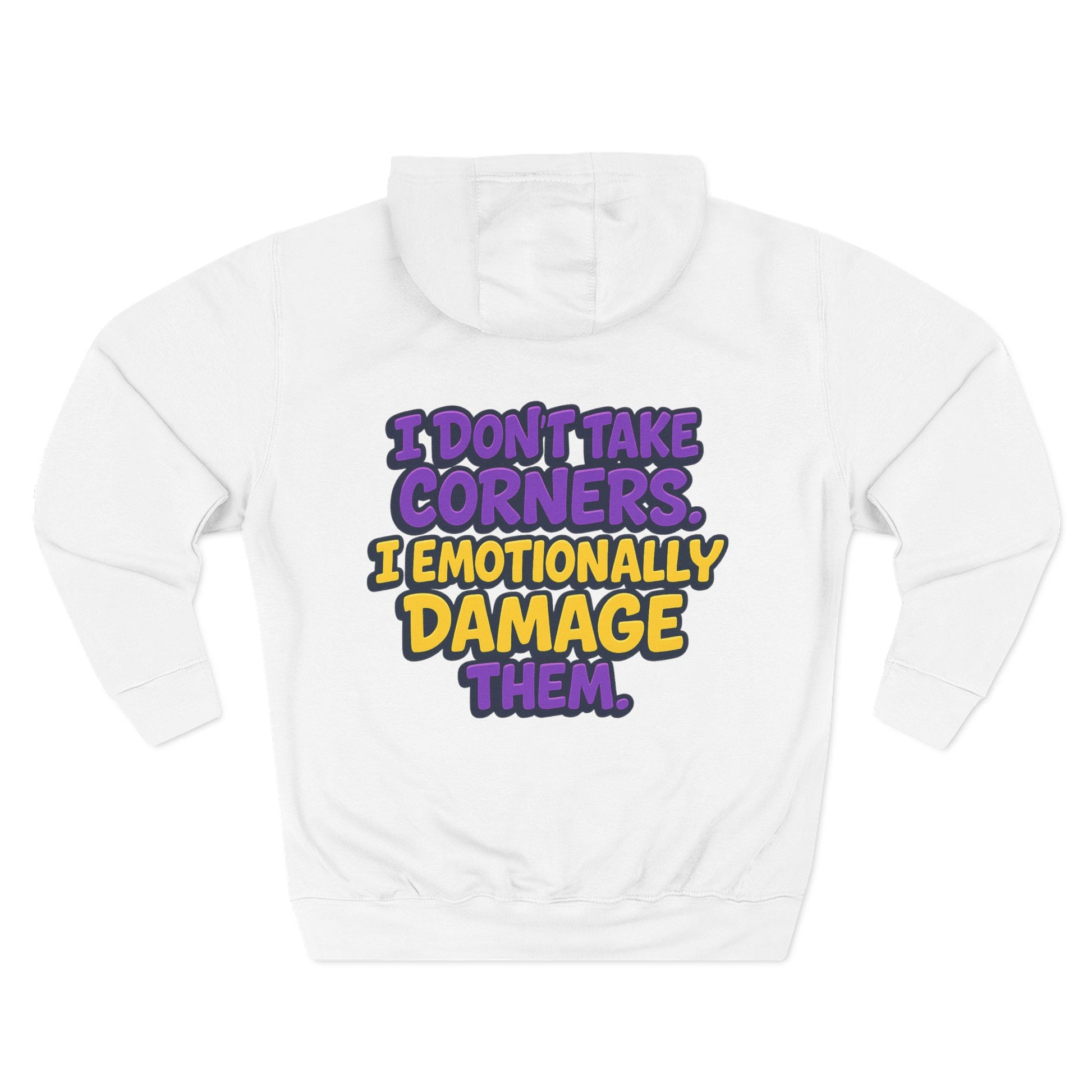 Matching playful quote on the back: “I Don’t Take Corners. I Emotionally Damage Them.”