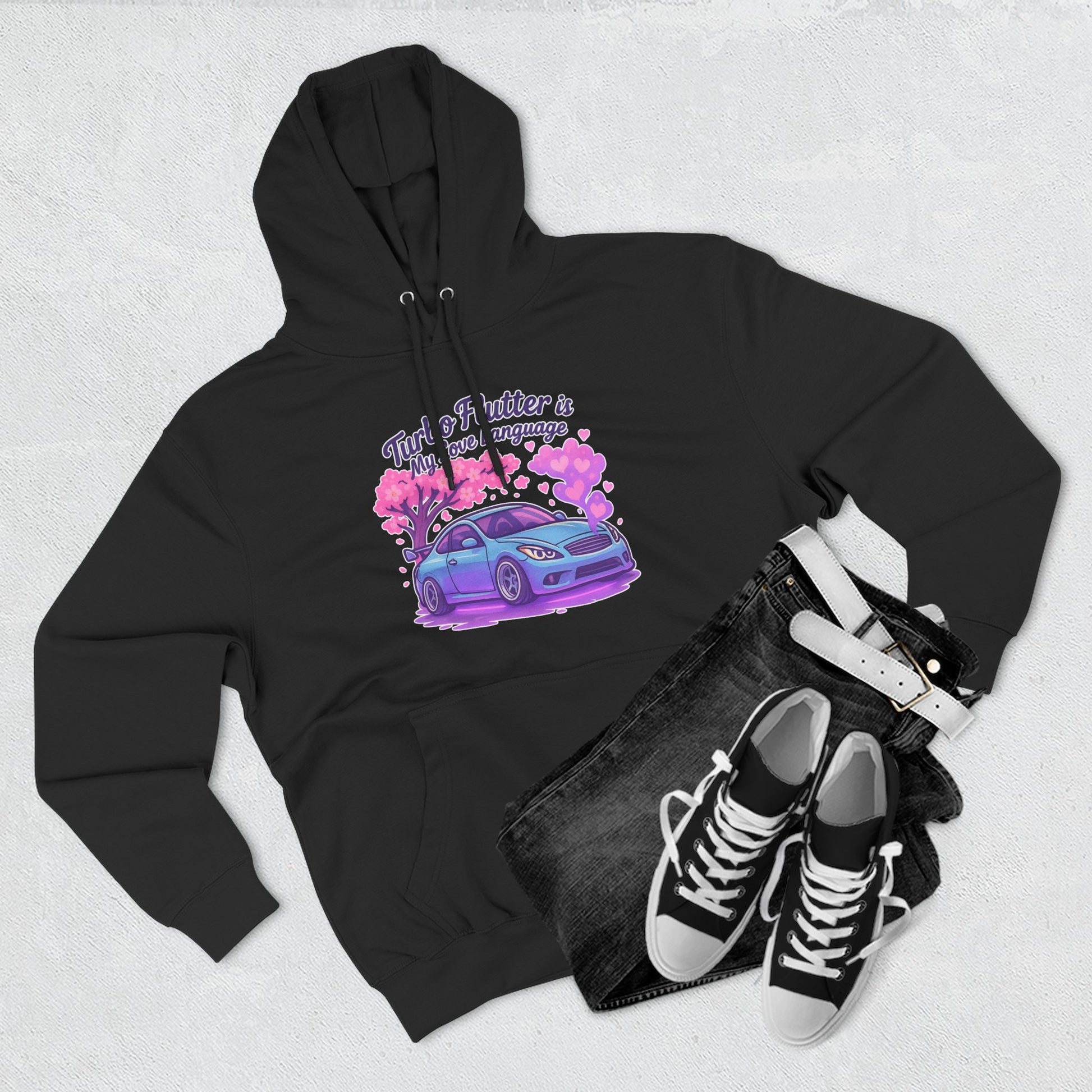 Vibrant cartoon-inspired drift quote on the back in purple & sunset gradients, matching your G37 hoodie front or standing alone in style.