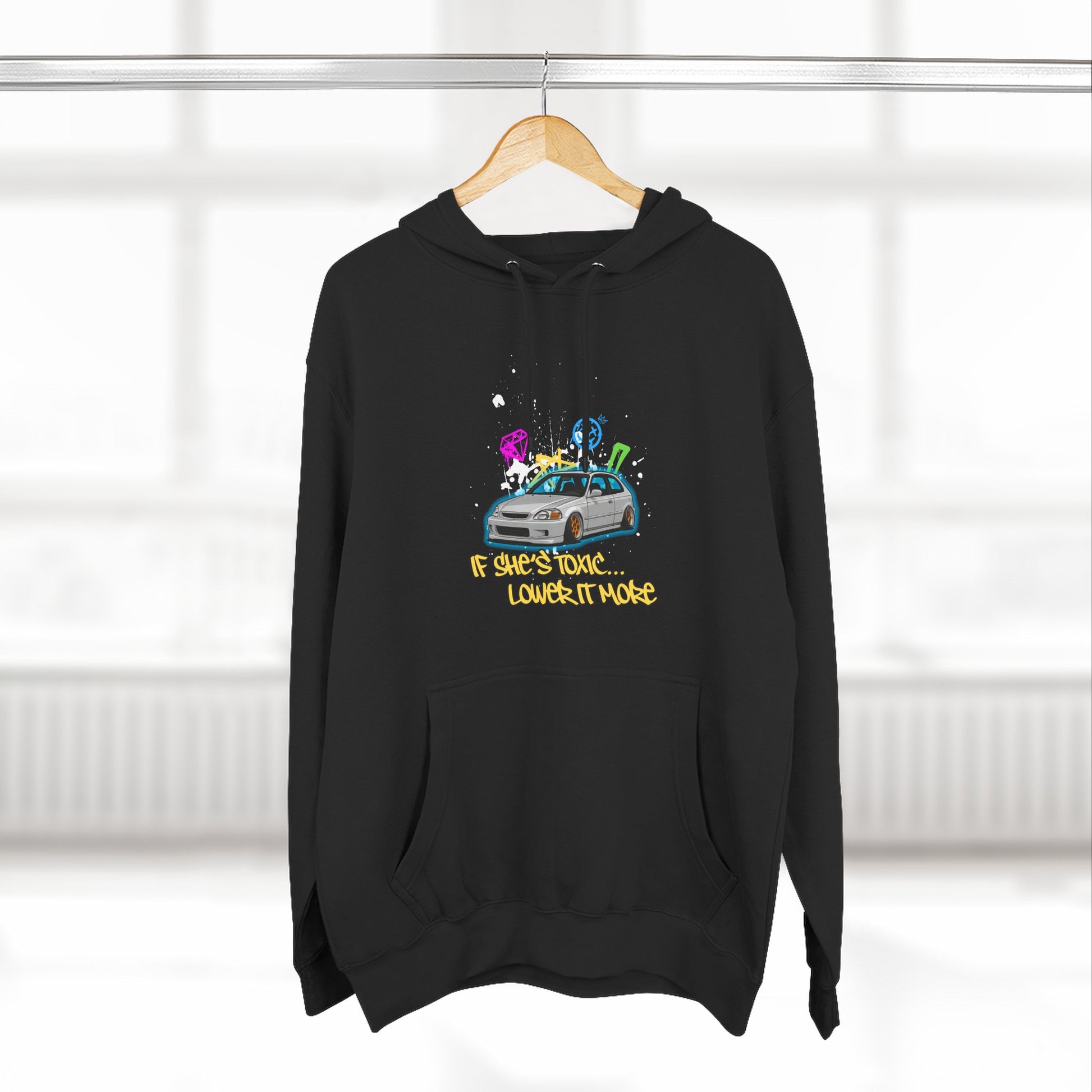 This bold hoodie features a stanced gray Civic EK Hatchback with a graffiti-style splash of color and the savage saying: “If she’s toxic… lower it more.” Perfect for anyone deep in car culture and not afraid to wear it loud.