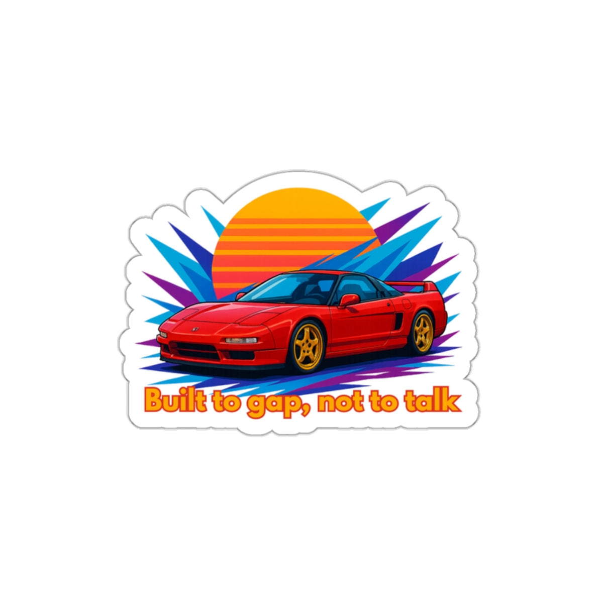 This high-quality JDM sticker features a bold red Honda NSX with gold wheels, backed by a vibrant retro sun design and the saying every street racer lives by: “Built to gap, not to talk.”